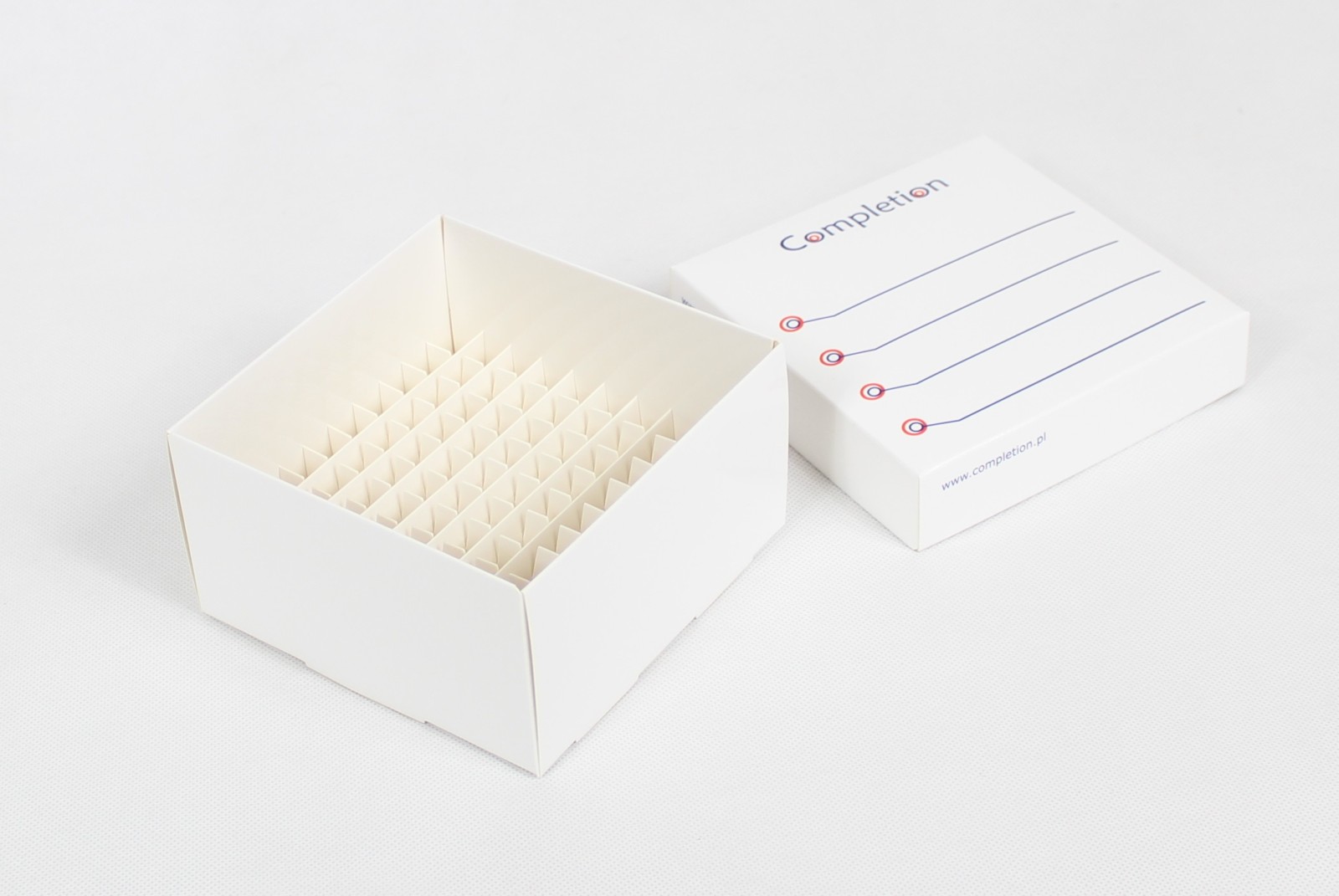 Kartonowe pudełko laboratoryjne o wymiarach 133x133x75 do przechowywania probówek w zamrażarkach niskotemperaturowych. Wewnątrz pudełka znajduje się wysoka 100 miejscowa kratownica 10×10 na probówki na krew lub kriofiolki. Kriopudełko wykonane z wytrzymałego, atestowanego kartonu litego w kolorze białym. Zewnętrzna strona pudełka oraz pionowe ścianki wewnątrz są dodatkowo powlekane folią, co chroni przed wilgocią. Kriopudełka wykonane są w technologii bez klejenia. Wszystkie narożniki denka i wieczka posiadają dodatkowe wzmocnienie, co wydłuża trwałość pudełek, wszystkie pionowe ścianki są podwójnej grubości. Na pokrywce znajduje się grafika umożliwiająca naniesienie opisów zawartości, a w razie potrzeby można napisy zmyć alkoholem.
