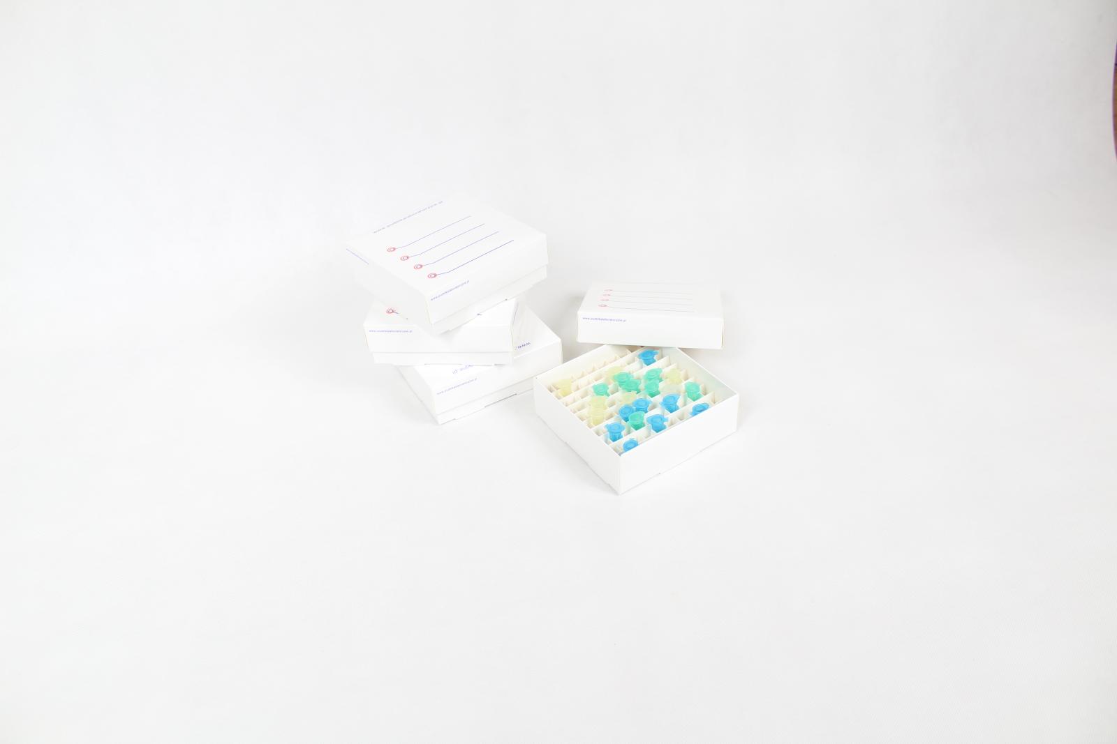 Kartonowe pudełko laboratoryjne o wymiarach 140x140x50 do przechowywania probówek w zamrażarkach niskotemperaturowych. Wewnątrz pudełka znajduje się estetyczna 100 miejscowa kratownica 10×10 na probówki typu Eppendorf o pojemności 1,5 / 2,2ml. Kriopudełko wykonane z wytrzymałego, atestowanego kartonu litego w kolorze białym. Zewnętrzna strona pudełka oraz pionowe ścianki wewnątrz są dodatkowo powlekane folią, co chroni przed wilgocią. Kriopudełka wykonane są w technologii bez klejenia. Wszystkie narożniki denka i wieczka posiadają dodatkowe wzmocnienie, co wydłuża trwałość pudełek, wszystkie pionowe ścianki są podwójnej grubości. Na pokrywce znajduje się grafika umożliwiająca naniesienie opisów zawartości, a w razie potrzeby można napisy zmyć alkoholem.
