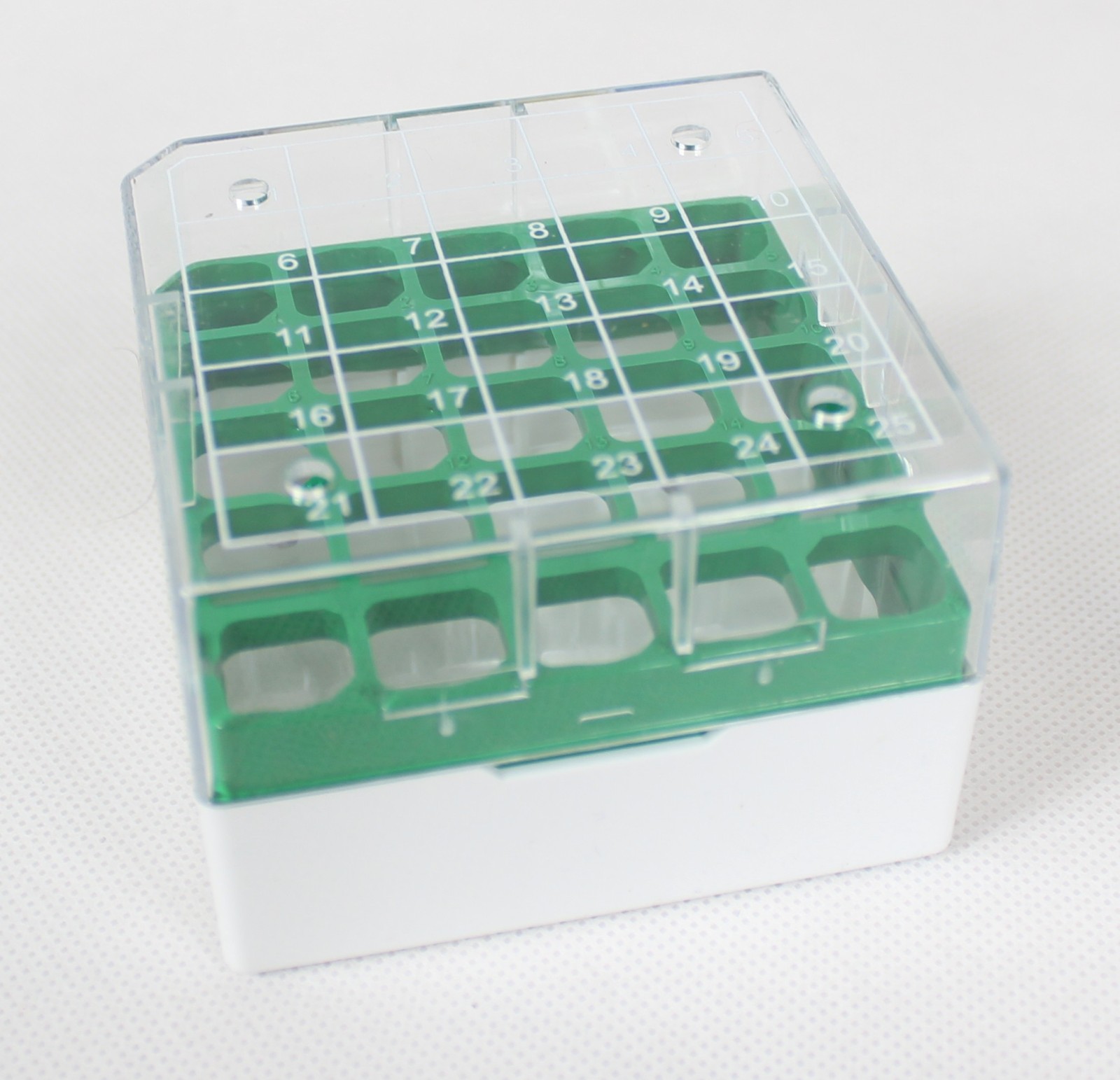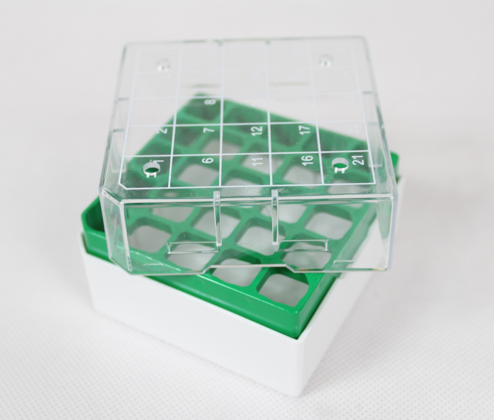 Wewnątrz pudełka znajduje się 25 miejscowa kratownica na kriofiolki. Spód pudełka w kolorze białym, pokrywka przeźroczysta, we wnętrzu pudełka znajduje się kolorowa kratownica. Kolorowe kratownice ułatwiają odnalezienie pudełka, a przeźroczysta pokrywka umożliwia podgląd zawartości bez konieczności otwierania.