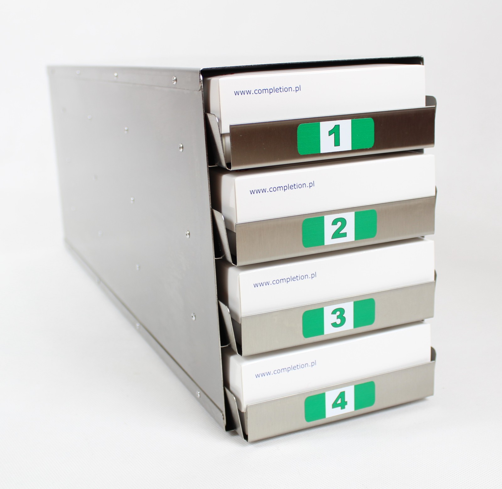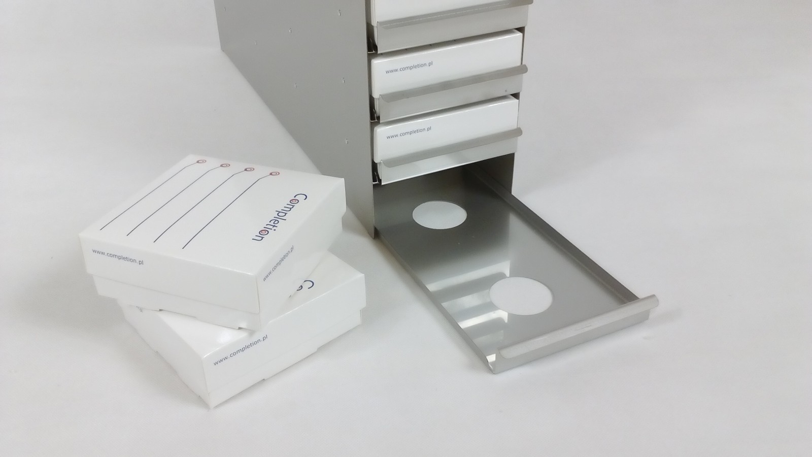 Stelaże z szufladami na pudełka (kriopudełka) to najwygodniejszy sposób na przechowywanie próbek w zamrażarkach niskotemperaturowych. Dostęp do pudełka jest bardzo szybki, wygodny i nie wymaga wyjmowania całego ciężkiego stelaża, a tylko pojedynczej lekkiej szuflady. Przechowywanie próbek w stelażach skraca do minimum czas otwarcia drzwi zamrażarki, pozwala najlepiej wykorzystać jej przestrzeń i oszczędza energię. Dotarcie do poszukiwanej próbki jest dużo szybsze, co przedłuża ich okres ważności.