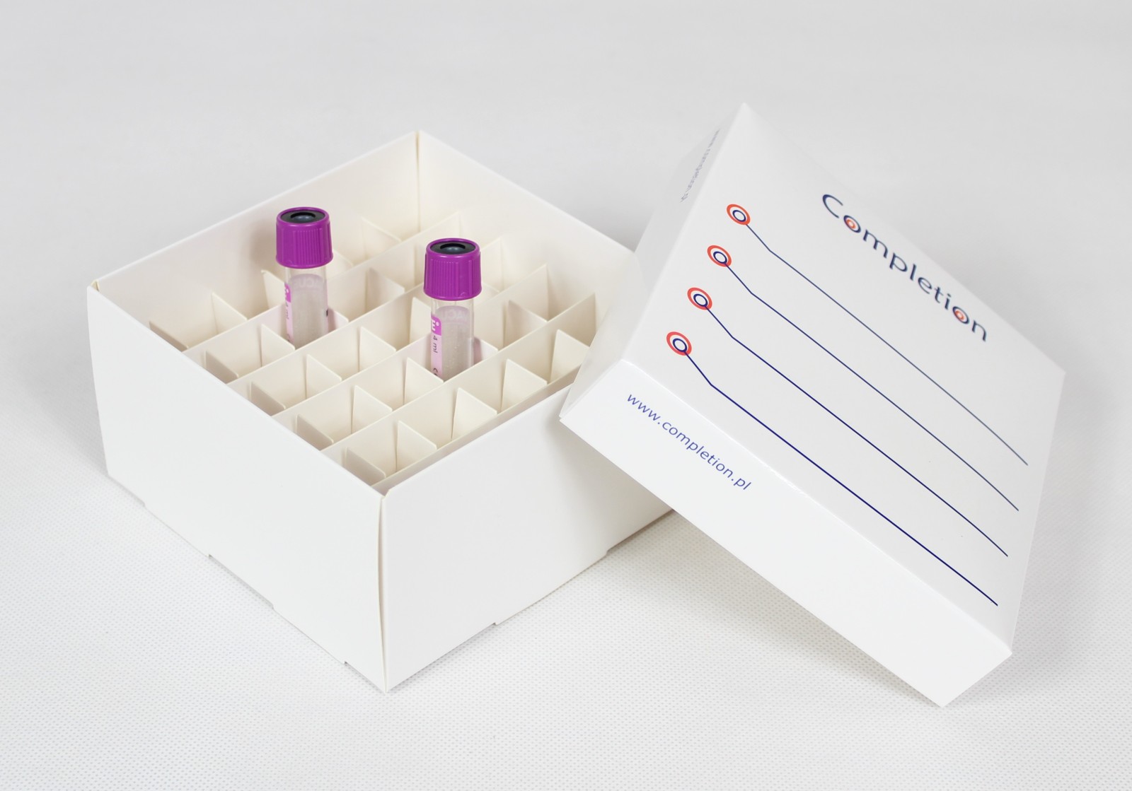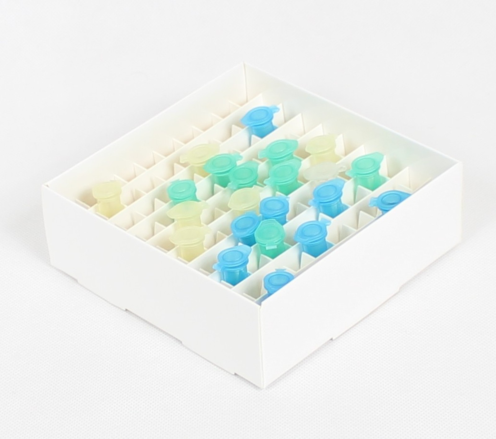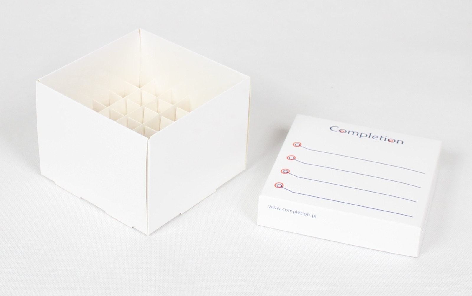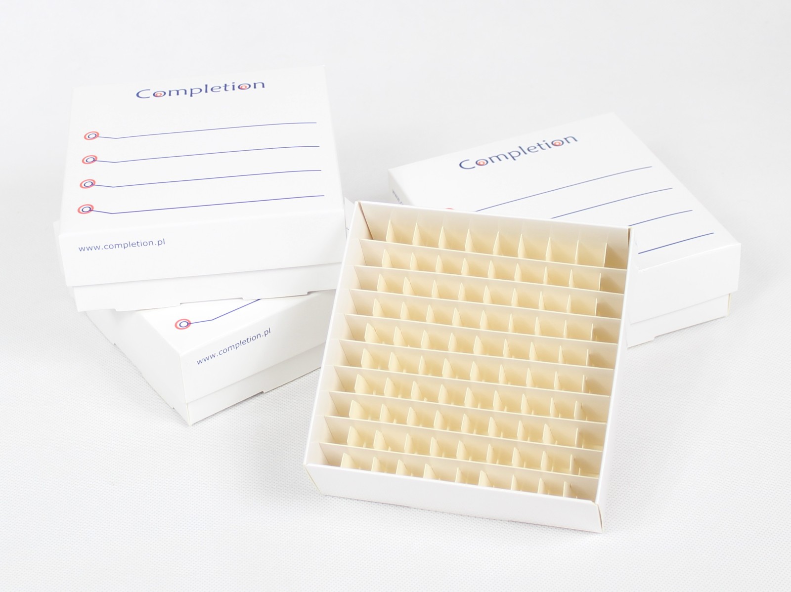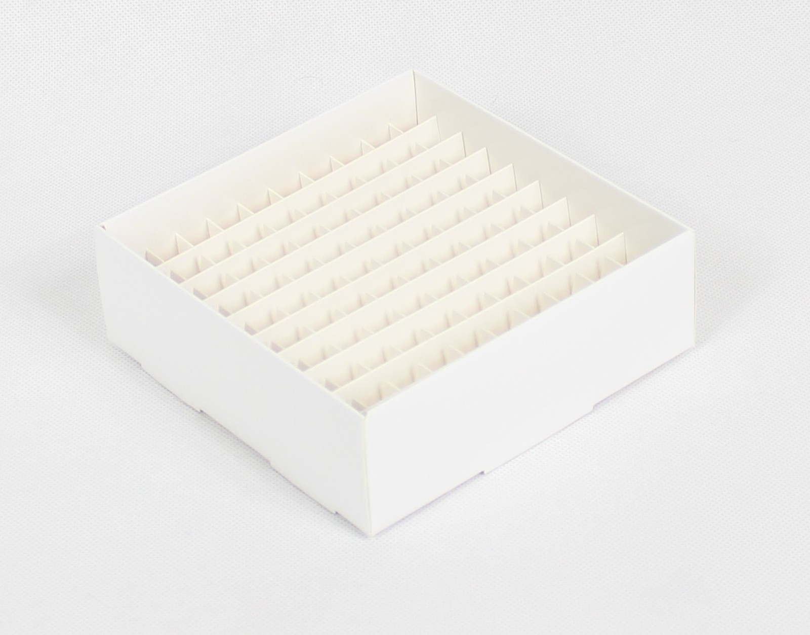 Pudełka laboratoryjne przeznaczone są do wygodnego przechowywania próbek w zamrażarkach niskotemperaturowych. Wewnątrz pudełka znajduje się kratownica na 100 probówek o pojemności 1,5-2,2 ml. Pudełko oraz pokrywka wykonane są z wysokiej jakości kartonu, powleczonego z jednej strony folią, chroniącą je przed wilgocią.