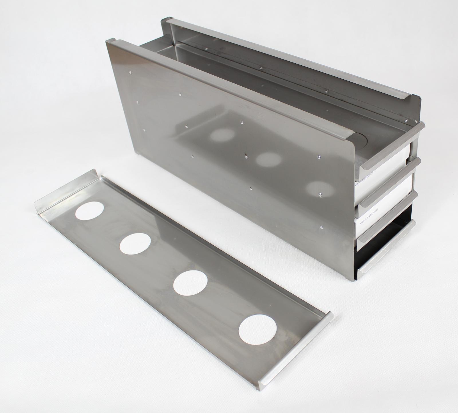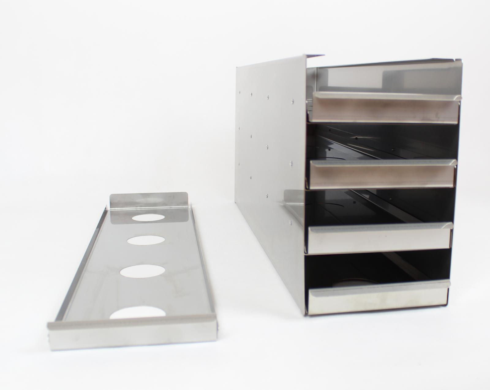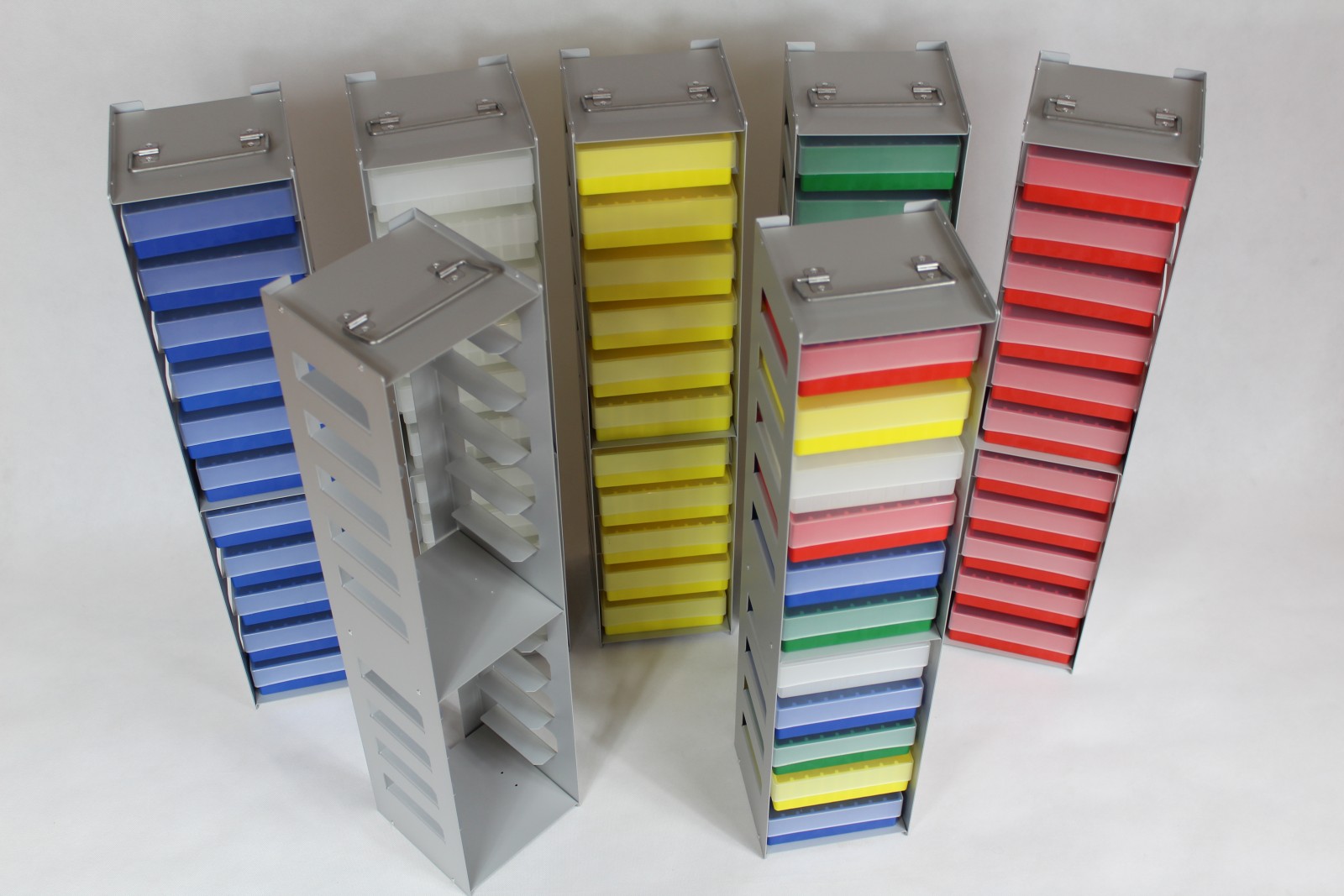 Stelaże aluminiowe i nierdzewne na pudełka ułatwiające przechowywanie próbek w zamrażarkach niskotemperaturowych naszej, polskiej produkcji. Przechowywanie pudełek w stelażach skraca do minimum otwarcie drzwi zamrażarek, i pozwala najlepiej wykorzystać przestrzeń zamrażarki. Dotarcie do poszukiwanej próbki jest dużo szybsze, co przedłuża ich okres ważności. Stelaże są dopasowane wymiarami do pudełek, a różna liczba półek pozwala dopasować je do konkretnych zamrażarek. Wykonujemy także stelaże z szufladami na pudełka oraz także bezpośrednio na probówki.