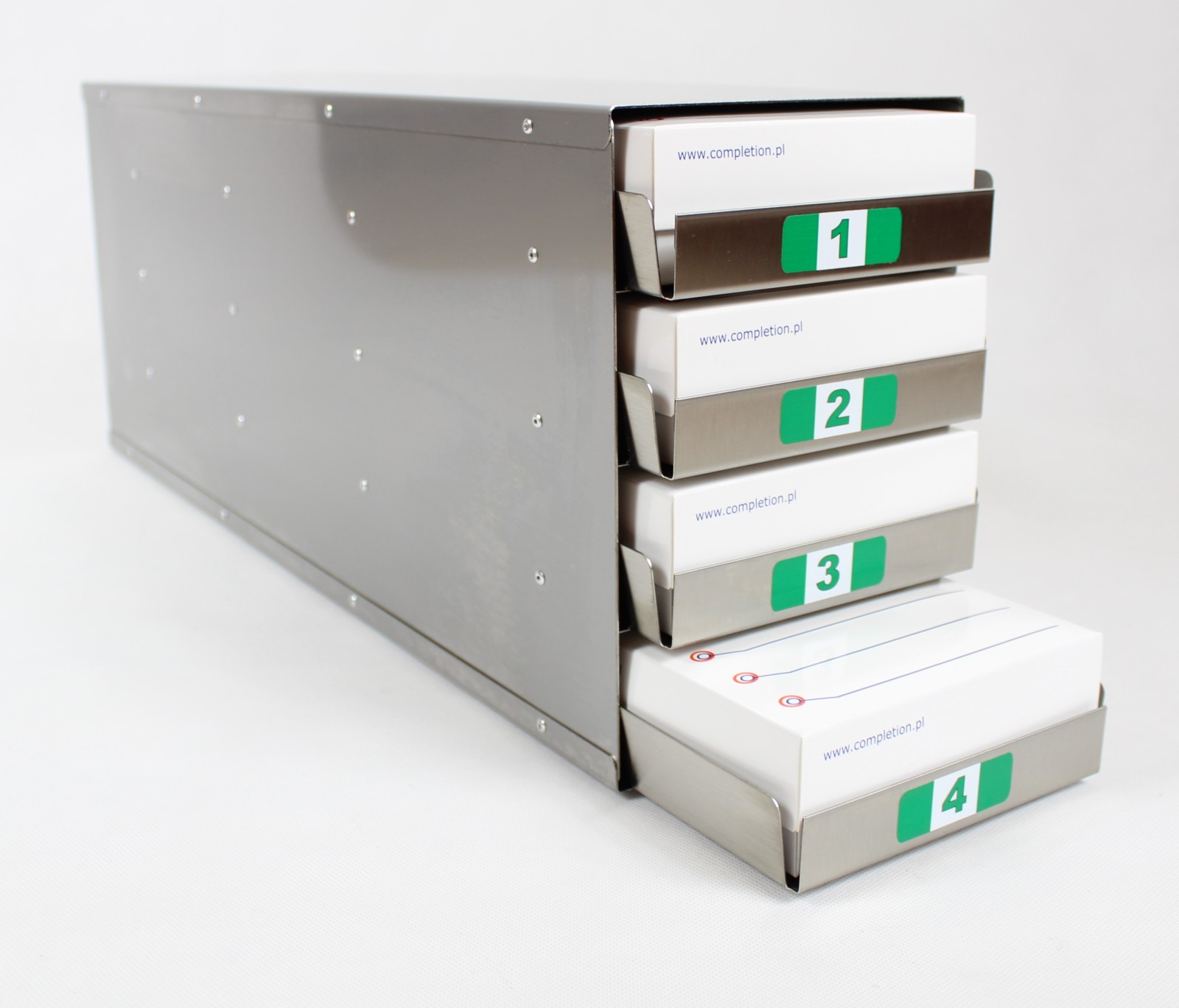 Stelaże ze stali nierdzewnej z 4 szufladami z przegródkami na 16 pudełek przeznaczone do przechowywania pudełek kartonowych i plastikowych w zamrażarkach laboratoryjnych. Dodatkowa funkcja w stelażach z szufladami to przegródki, które zapobiegają przesuwaniu się pudełek. Kolorowe naklejki z numerami umieszczone na każdej szufladzie stelaża ułatwiają odnalezienie próbki w bardzo krótkim czasie, co znacząco wpływa na jej okres ważności.