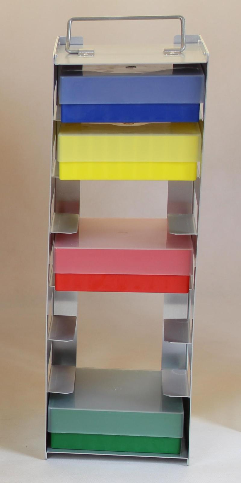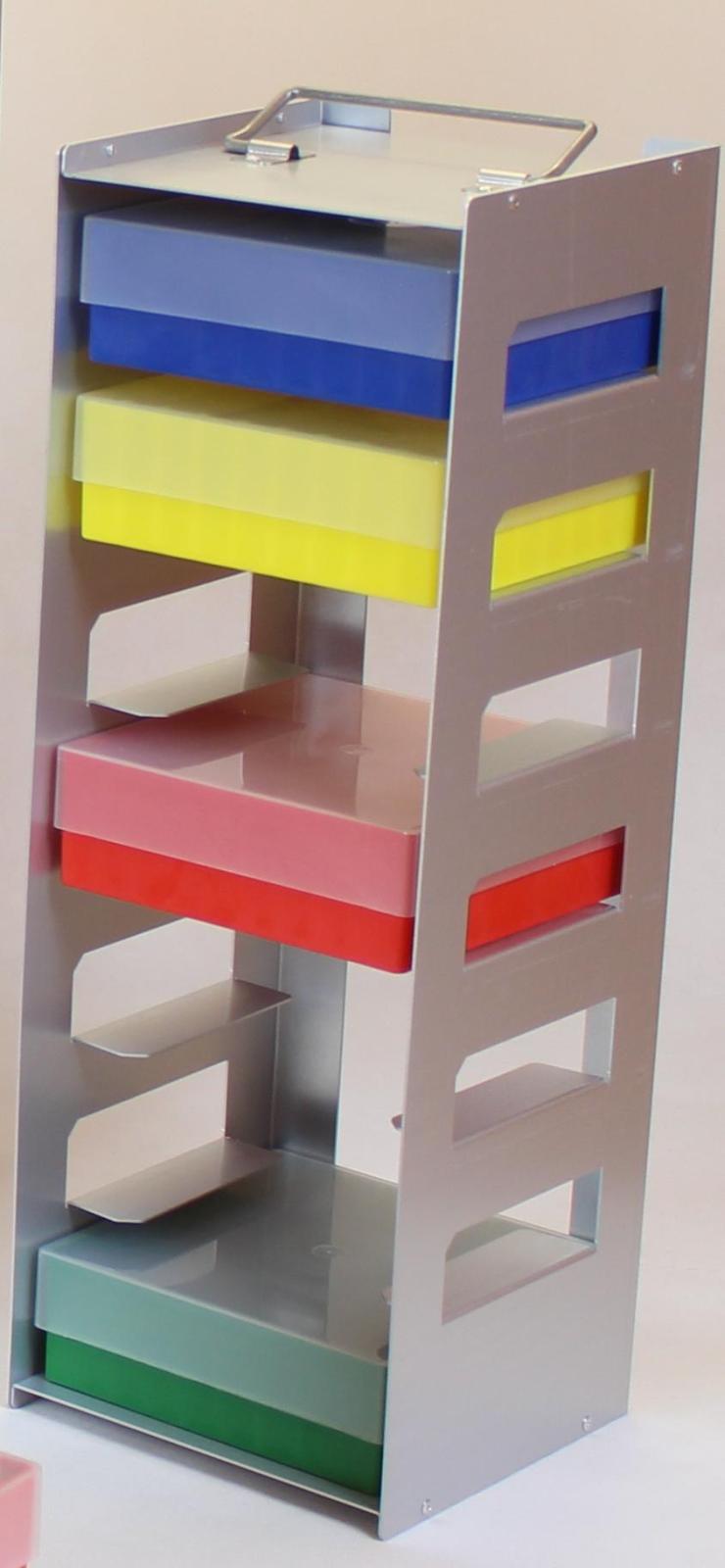 Cechy: lekkie, stabilne, szybki dostęp do próbki, stelaże aluminiowe w małym stopniu obciążają zamrażarkę, powyjęciu stelaża małe szronienie, minimalizują czas otwarcia drzwiczek zamrażarki